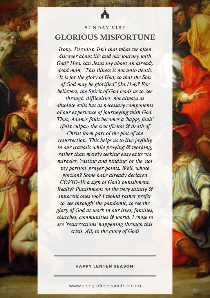God does not remove the storm. God rather guides us through the raging storm. The birth pangs have always remained part of a mother’s experience. Yet, the praise of God resounds at the birth of a child. Sometimes the mother may not even live to see this joy. Sometimes the mother and child do not live through the pangs. Joy and sadness often seem intermingled, so also love and hate, good and evil. Jesus asks us to focus our minds on the glory of God, which the Spirit speaks to us in the midst of all our troubles, trials and temptations. In the glory of the Lord is resurrection, not just of our mortal bodies – because there could be ‘resurrection’ without the spirit of God (Ezekiel 37: 12-14). It was only after the ‘Spirit of God’ was put into them that they lived. Sometimes, it is not about the death of the flesh, which undoubtedly is very painful and heartbreaking, but about a spiritual renewal and transformation that makes even the living to live truly for God and for the good of all. In a world that has grown so greed and marked by so much poverty, inequality, conflict, and lack of compassion, there is a need of this form of spiritual resurrection. Is the current crisis an opportunity? Perhaps, yes!