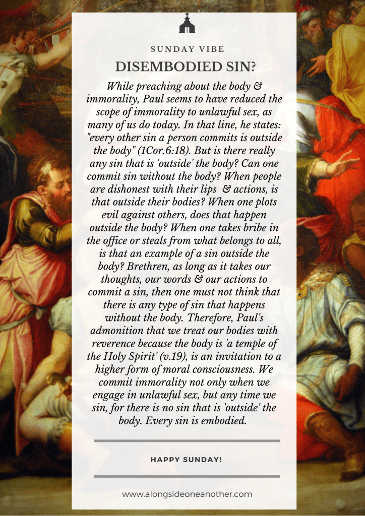 Sunday Vibes #SV – Disembodied Sin? Send to friends Click to share on WhatsApp (Opens in new window) WhatsApp Click to share on Facebook (Opens in new window) Facebook Click to share on X (Opens in new window) X Click to share on LinkedIn (Opens in new window) LinkedIn Click to share on Telegram (Opens in new window) Telegram Related