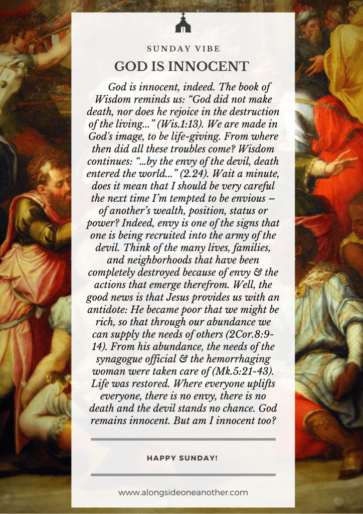 Oh yes, that’s the verdict. God is indeed innocent of the senseless deaths and destructions in our world today. God is life in itself. God is the giver of life both temporal, mortal life and eternal life.