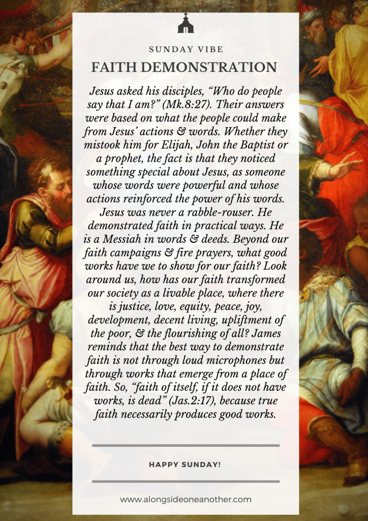 True faith necessarily produces good works. If it is true faith, then good works become a natural consequence – agere sequitur esse. Here lies the litmus test of faith, the ‘taste of the salt’ of the Gospel. The good works must not be limited to the ones that are done in the closet, rather faith should be capable of bringing the reign of God in the world as a place of justice and flourishing of all. The works of faith should challenge the status quo of needless suffering, of abject poverty, corruption, culture of death, and injustice anywhere. Faith, with its necessary works, should not be hidden under the bushel.