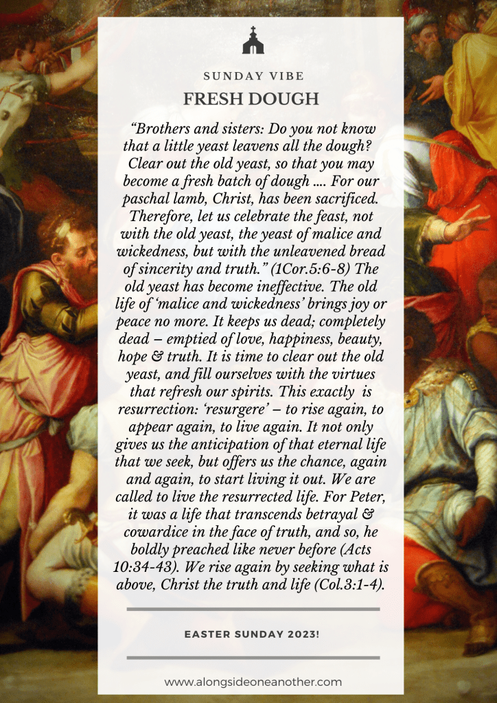 However, this is no mere rhetoric that should be swallowed in the dancing and shouting of Alleluia every Easter vigil. Rather it should be our daily reality – to live as the forgiven ones, whose lives have been renewed, refreshed and revitalized in order to live for God and for one another. For it is only in God that we can truly live anew, like fresh doughs.